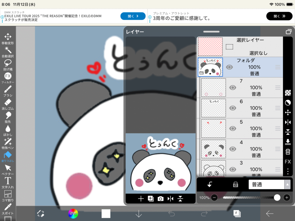 右側にレイヤーを表示しているところ。無料アプリで上に広告が出ています。