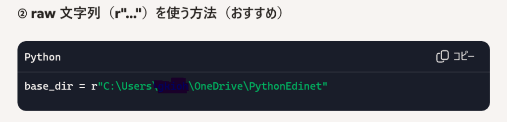 人様の書かれたコードをベースにとりかかります。もう最初の保存ディレクトリを自分用に指定するところからエラーが出て、意味わからん。以前に少し作業したとき頼りになったCopilotに聞いたところ(どう書けばよいですか?の「どう」が抜けているけれど、察してくれた😅)、